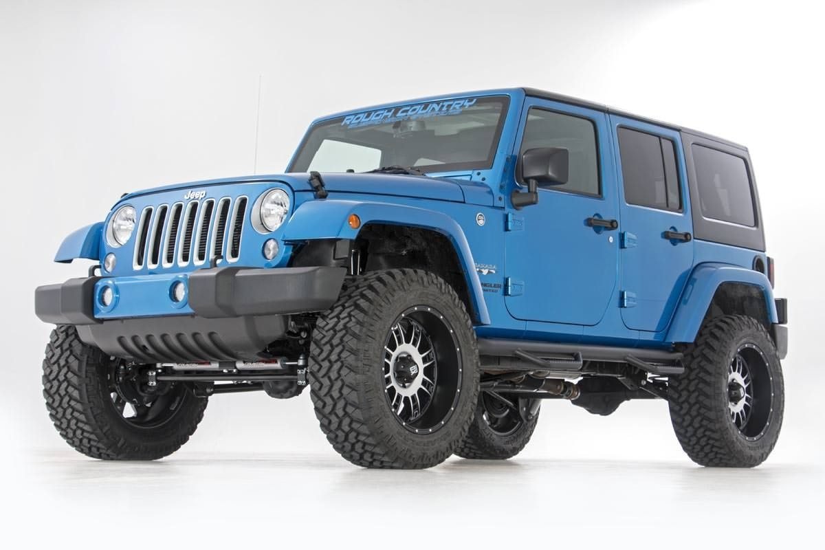 Run 35×12.50 tires on your four door Jeep Wrangler Unlimited JK with the Rough Country 3.5in Suspension Lift Kit with Control Arm Drop. Rough Country tunes their coil springs to the OEM spring rate, for a lift that rides like a factory Jeep. The included control arm drop brackets are designed to optimize your Jeep’s front driveline geometry. Rough Country includes either their N3 or Vertex remote reservoir shocks with this kit. The twin-tube nitrogen-charged N3 shocks provide smooth a smooth ride with 10-stage variable valving. For additional versatility, Vertex Remote Reservoir shocks are fully adjustable. They are equally at home on the highway and on the trail, and you can optimize compression at the twist of a knob. Rough County’s V2 shocks feature a monotube design that separates the shock oil from high-pressure nitrogen. This reduces cavitation and fade, and makes for a high-performing off-road shock.