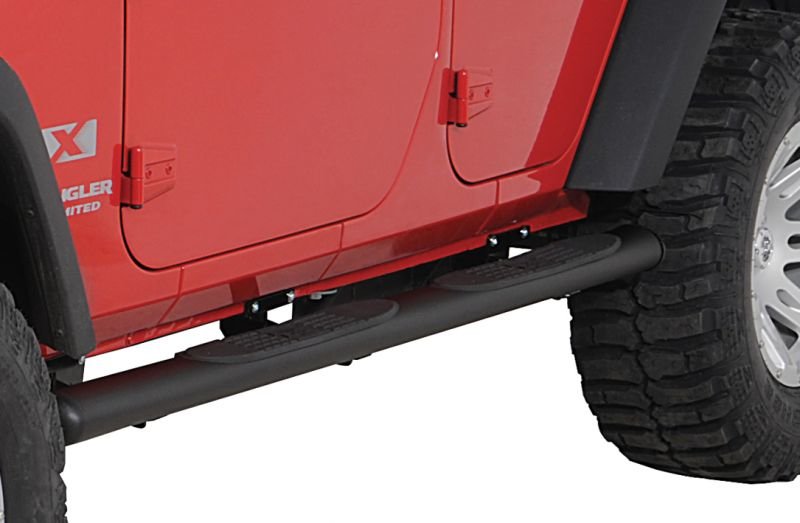 Due to the wide oversized flares and larger tires, an oversized tube step looks better on the 2007+ Wrangler. This 4″ oval design provides an enhanced step area to make it easier to get in and out of the vehicle. The straight oval design is similar to the MOPAR 3″ tube step as it begins and ends just inside the fender well. Tough E-coat powder coat finish provides the ultimate in rust protection. Available in textured black which complements the vehicle’s fender flares.