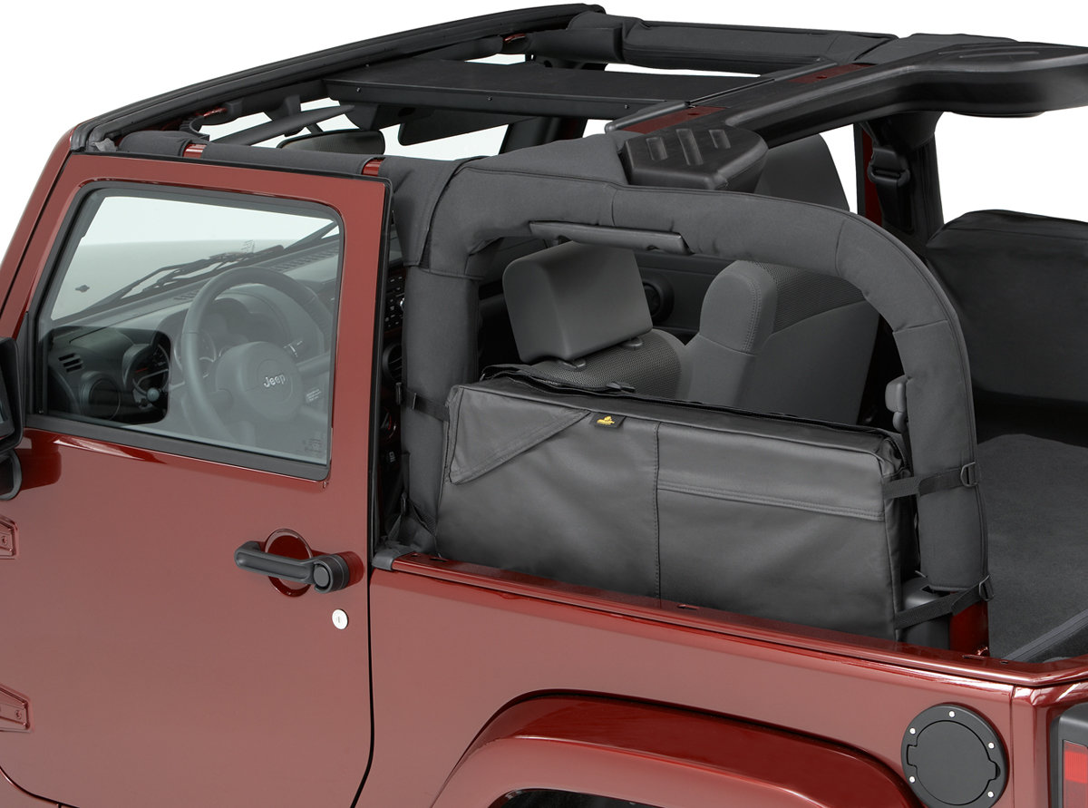 Handy storage bags zip shut and feature external pockets for quick access. Bags attach to the roll bar braces with rugged hook and loop straps. Available in factory-match colors to coordinate with other accessories. Larger Saddle Bag for Wrangler JK has convenient shoulder strap and sold individually Saddle Bag.