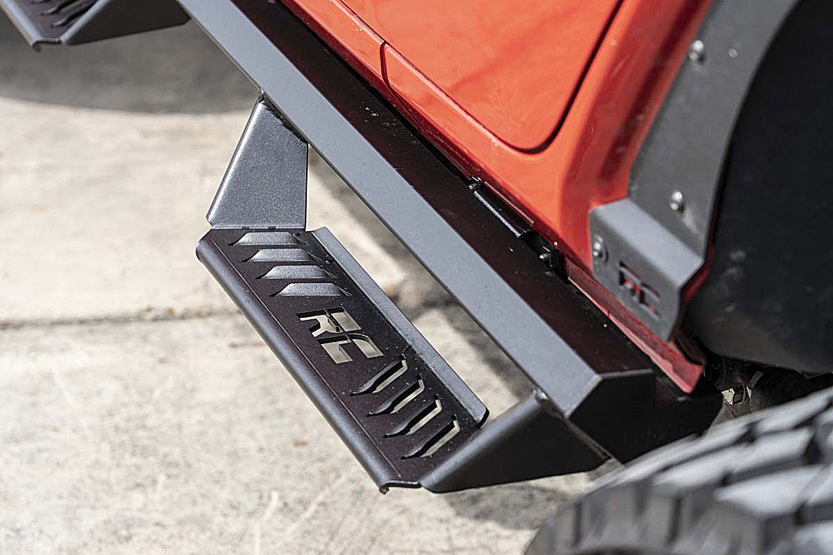 Durable, aggressive, and with a tight-fitting tube that hugs the body of your Jeep for the ultimate, clean look – Rough Country’s AL2 Drop Steps help set your Jeep apart from the pack. These 100% aluminum constructed steps offer a long lifespan of corrosion resistance in off-road environments.The fully welded, 1-piece design offers unsurpassed strength and is easy to install! The drop steps feature a louvered design that makes it easy to secure your footing in any condition, while the wide step profile offers plenty of room to plant your foot and looks fantastic on any lifted Jeep. Upgrade your Jeep with Rough Country’s AL2 Steps and you’ll feel the difference every time you climb into the cab.