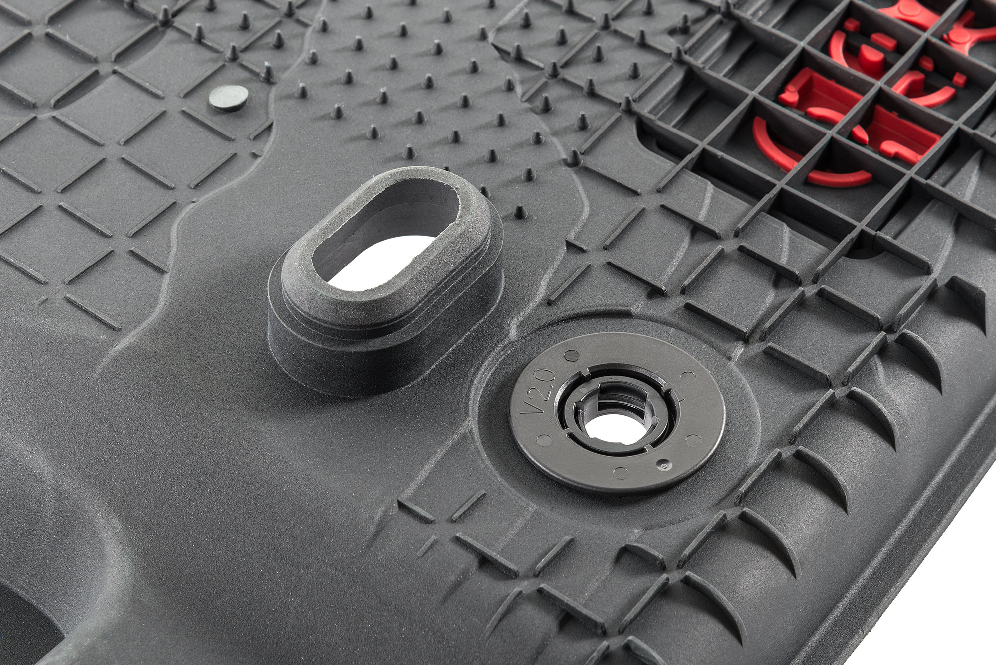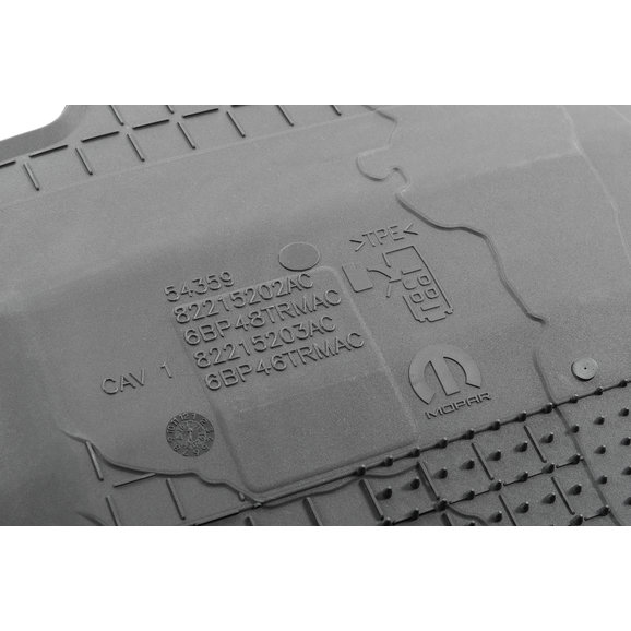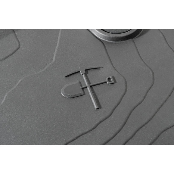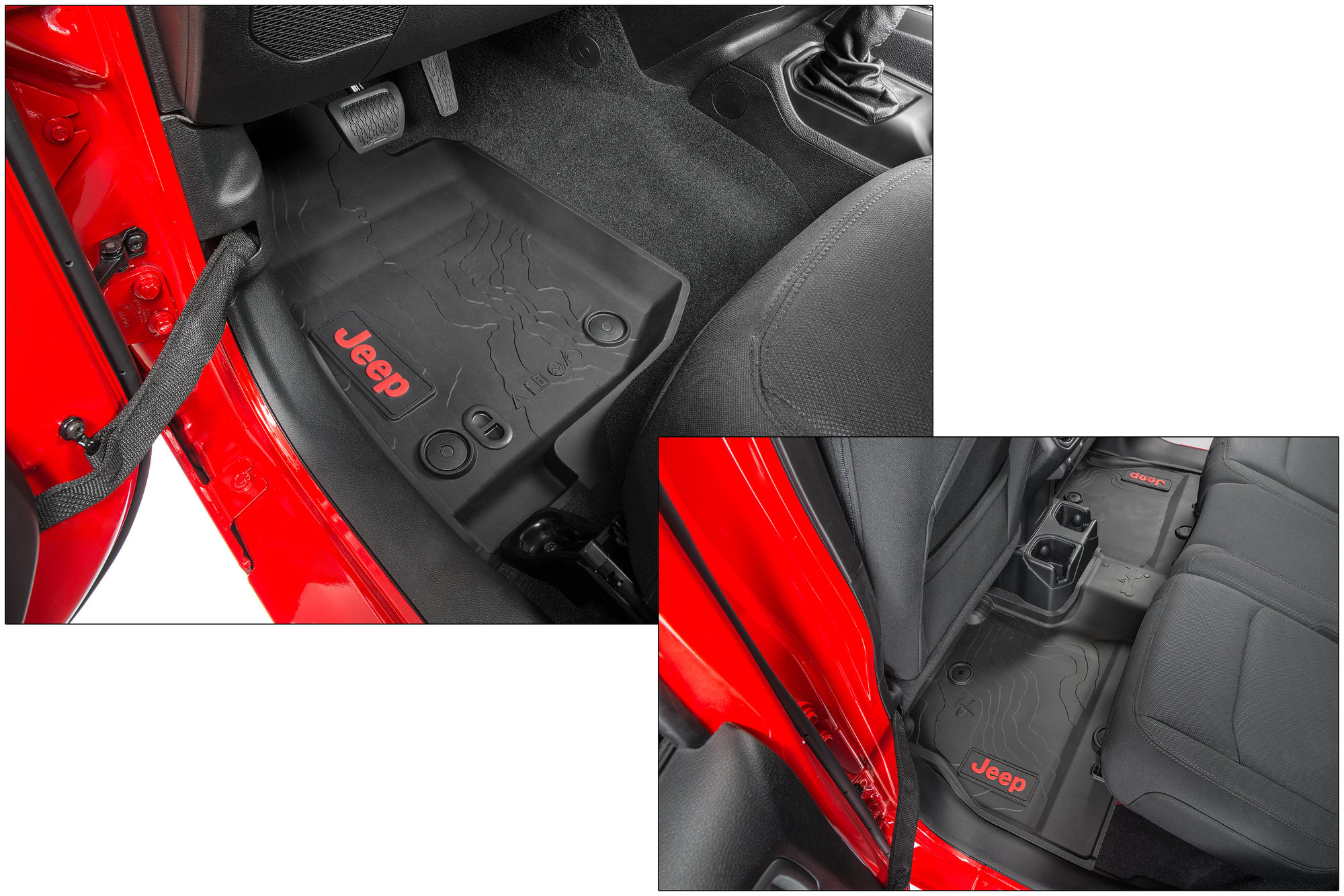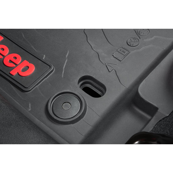 Protect the floor of your new JL with the Mopar All Weather floor liner pair. This 3-piece set will fit into the driver and passenger side front foot wells, and the rear seat foot wells, and will protect the floor from any wetness front snow, mud, sand, rain or anything else that could possibly be trekked in from the outside elements. The floor liners are a high wall, bucket-style construction that provides maximum coverage and protection. The front set features a terrain style pattern with the red Jeep brand logo. They fit perfectly over the front drain holes to allow for draining without having to remove the mat. The mats will stay in place with the durable nibbed backing and grommets that attach to the factory retention posts.