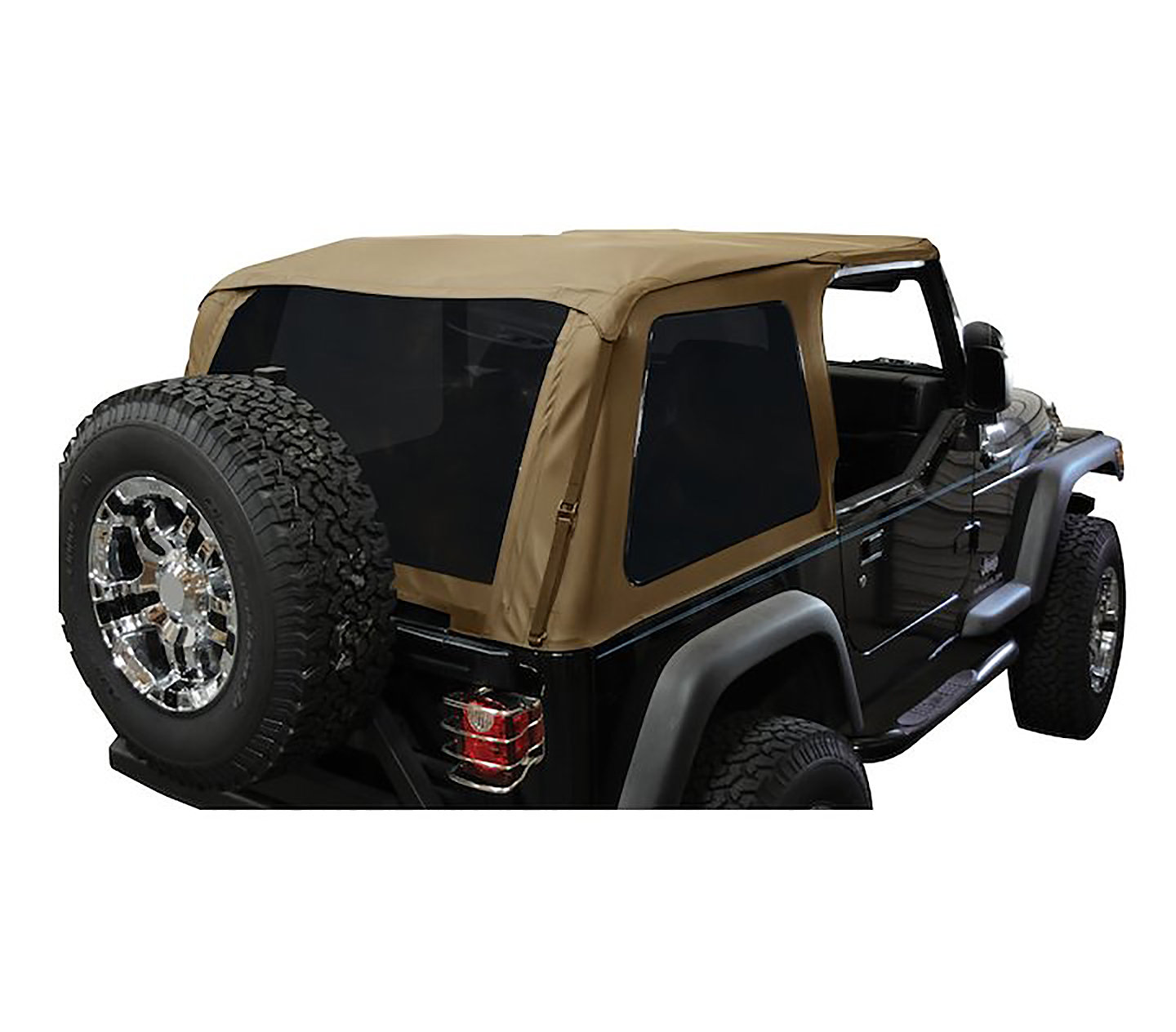 The Crown Automotive Bowless Soft Top is the perfect solution for Wrangler TJ owners who desire a different look for their Jeep or find themselves not using the folding function of a factory style soft top. When its time to replace your factory top and want a more sleek design that hugs the contours of the Jeep, then its time to consider a Bowless Soft Top. This top reuses some of your factory hardware such as the door surrounds and tailgate bar, but is designed to function like a Bikini Top with windows so you will need a new windshield channel for the front if you do not have one already from a previous Bikini Top. The windows are a 30% tint, which is D.O.T legal in all 50 US states, and can be easily zipped in and out for a more open ride when you hit the trail or are driving your daily commute.
