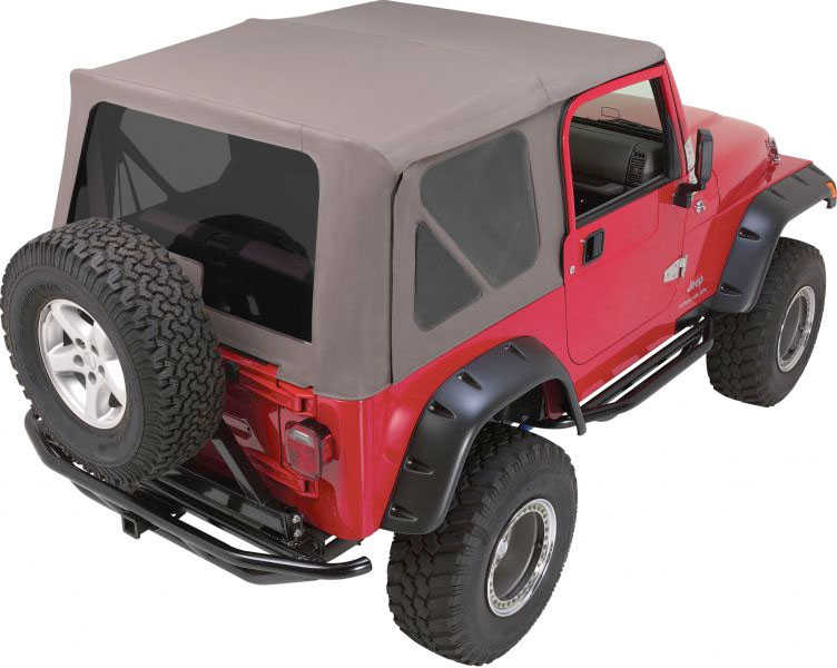 The TJ Complete Soft Top kit by Rampage includes Fabric Top, vinyl windows, re-engineered fold down framework, bows, hardware and all accessories necessary for a new top installation. It comes with easy to follow instructions and is packaged in convenient, durable canvas storage bag.