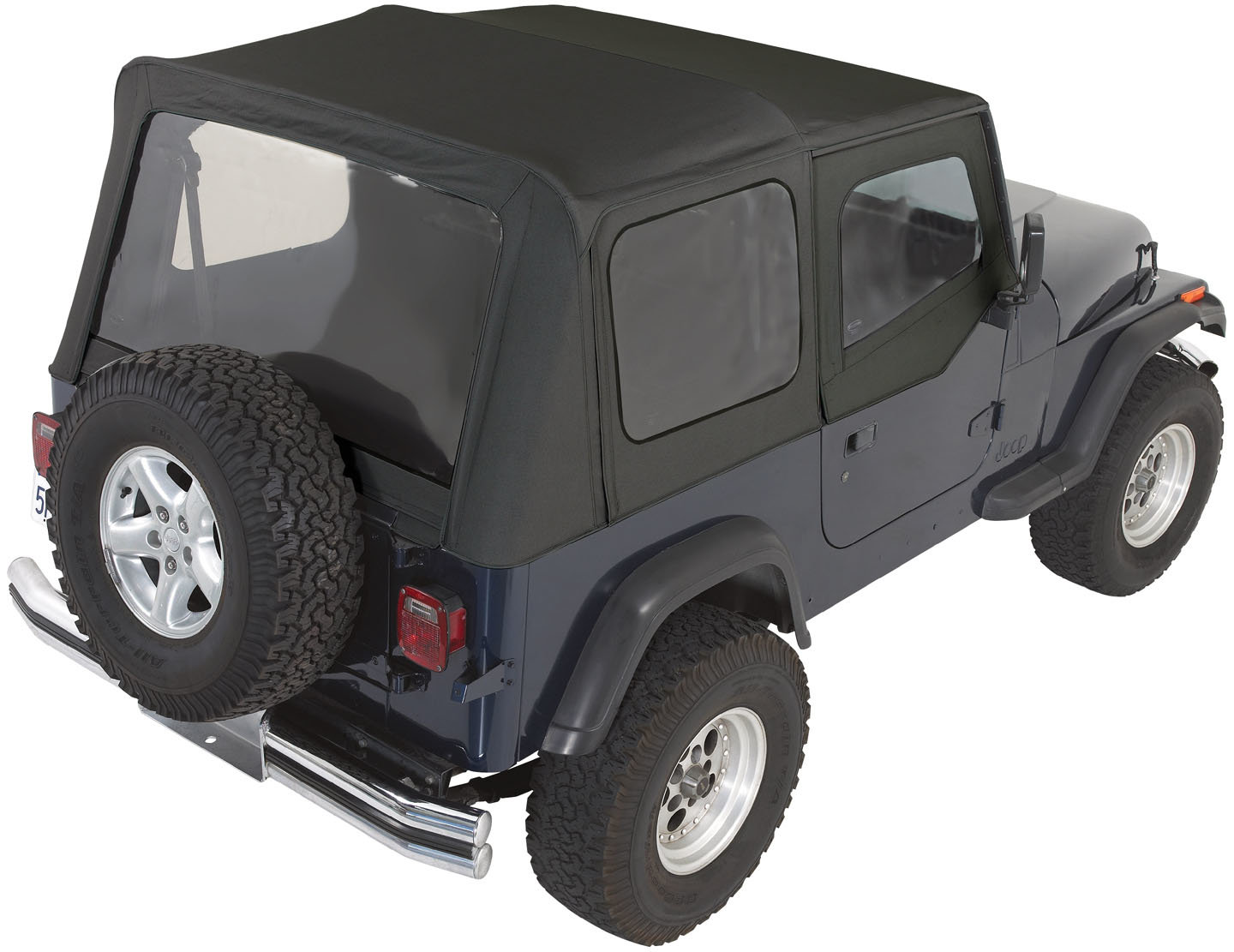 The YJ Complete Soft Top kit by Rampage includes Fabric Top, vinyl windows, new framework, bows, hardware and all accessories necessary for a new top installation. It comes with easy to follow instructions and is packaged in a convenient, durable Canvas soft top storage bag.