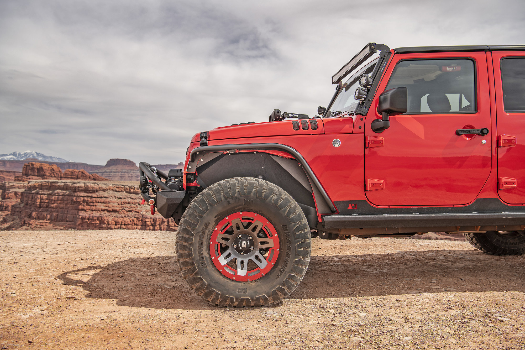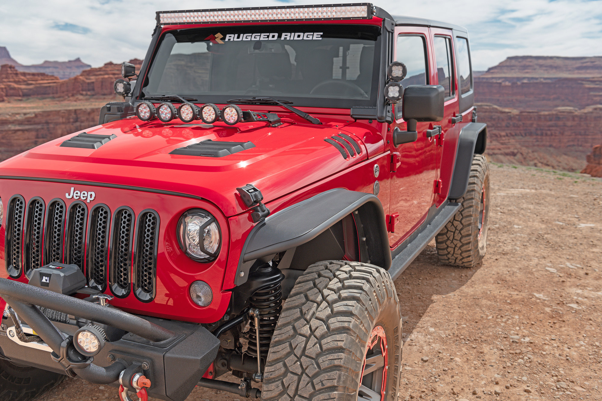 Rugged Ridge Tube Fenders were engineered to suppress the sound of tire meeting flare. With this 07-18 Jeep Wrangler JK Front Flare kit you can outfit your jeep to have increased tire clearance and reduce those awful noises that are made from tire hitting flare, do to clearance issues. This 2 piece set of Front Steel Tube Fender Flares by Rugged Ridge come in a durable black powder coat finish and are made from 100% steel construction. These Heavy duty flat steel fenders with tube styling are a perfect solution to overcome that horrible noise of ‘bottoming out’ when tire hits flare, which makes you cringe when on the trail. Get a whole new level of enjoyment from your off road experience with the Rugged Ridge Steel Tube Fender Flares.