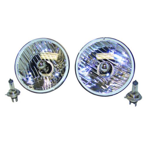 Most Jeeps; Sold In Pairs; 7″ Round Assemblies;, H4 55/60W Bulbs; Cast Housing; Clear Glass Lens; Meets DOT/SAE; Convert from conventional OEM sealed beam headlamps to halogen lamps