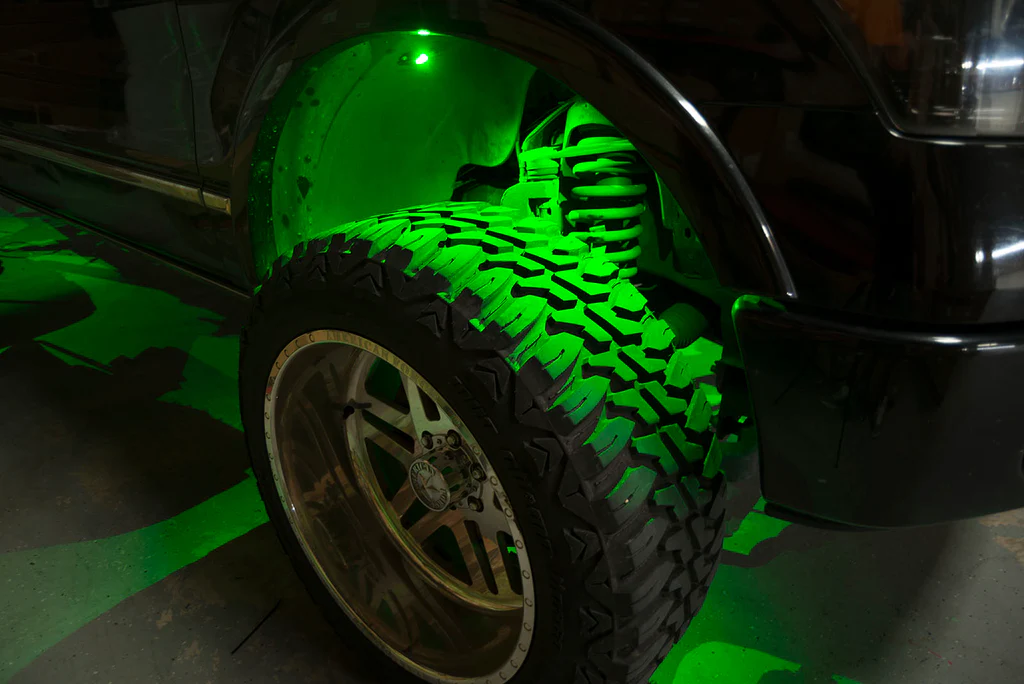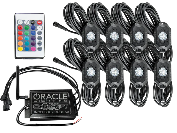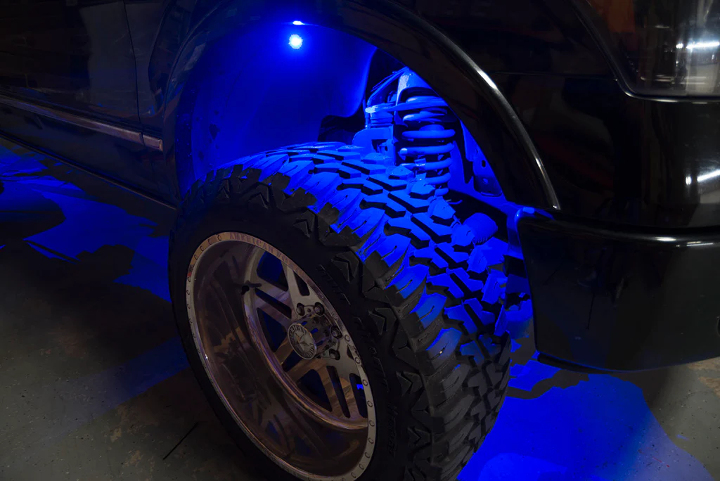 Change Colors, Control Brightness and Strobing, and Control your Lights with your Music! This new “Dual-Control” ORACLE Underbody LED Rock Lights now features Bluetooth Smartphone control PLUS Wireless Remote. This kit can be installed in the wheel wells in front of and behind each tire. Our ColorSHIFT® Technology allows you to select from thousands of colors! Control the functions and colors of your kit via the Bluetooth App, or Remote!