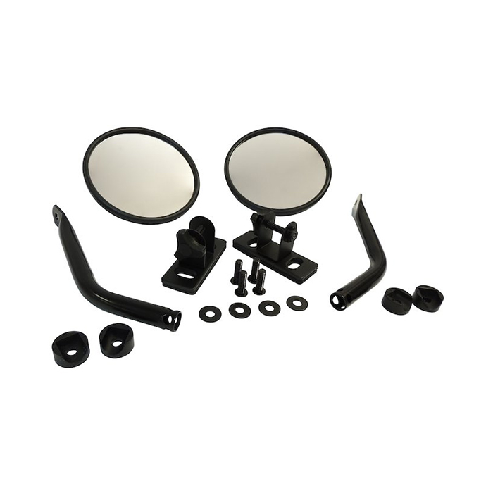 • RT Off-Road’s Quick Release Mirrors are a great solution for those who want to drive without doors, but require side view mirrors. The gloss black powder coated brackets mount directly to the side of the upper windshield hinge. The included mirror arms and heads attach to the brackets with a thumb screw to allow for a quick release.