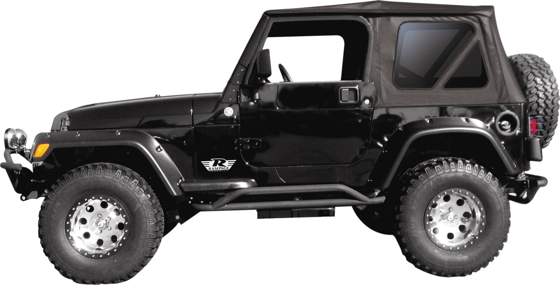 Replace aging, worn out factory soft-top and gain some additional storage space inside the driving compartment. All the features of the original factory top with exclusive Rampage added zippered storage pockets. Produced in original factory specifications and colors, the Rampage replacement top easily installs over factory framework, and attaches to factory mounting points and Original Equipment belt rail attachment System. Fits all factory applications and includes the top fabric, rear and side windows.