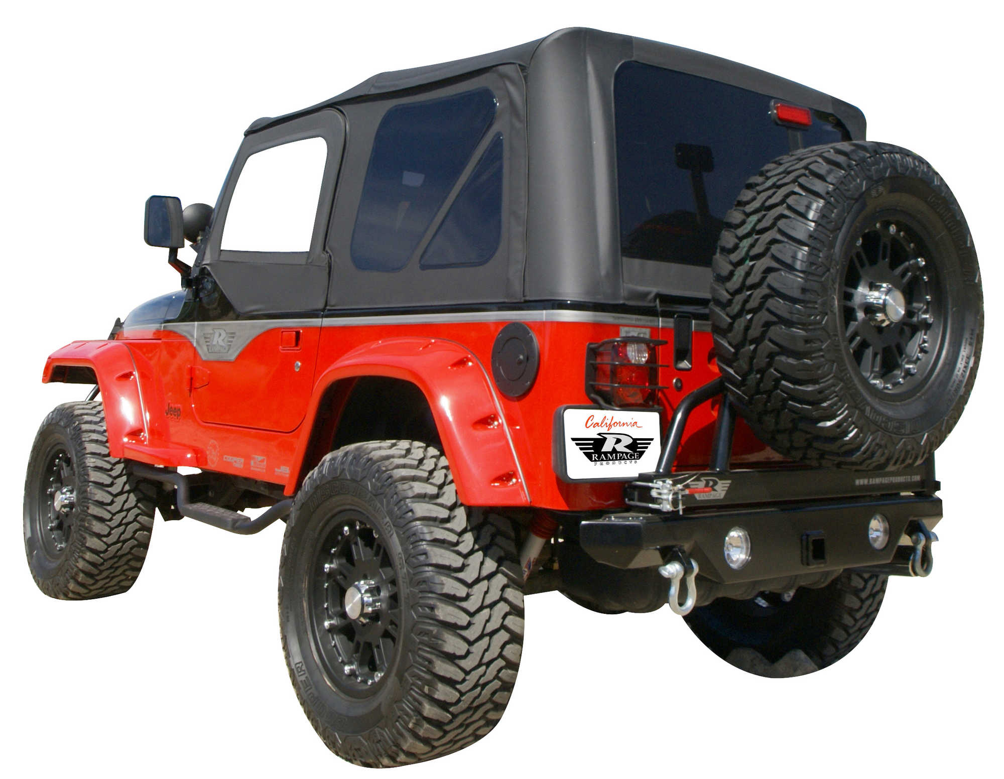 The new Rampage Replacement Top Plus soft tops have all the features of the factory soft top plus exclusive Rampage upgrades and benefits for a truly improved Premium Top. Durable, Heavy Duty Sailcloth fabric for superior insulation and a noticeably quieter ride with patent pending front anti-puddle support poles for improved water runoff and wind noise. Located in the front above the windshield are exclusive Rampage interior storage pockets conveniently located over the driver and passenger side. Self Correcting marine grade molded tooth zippers makes for easy installation and removal. The replacement plus top fastens to your factory framework and belt rail attachment system. Includes matching upper door skins and DOT Compliant dark privacy tint for back and rear windows. Exclusive three year limited warranty.