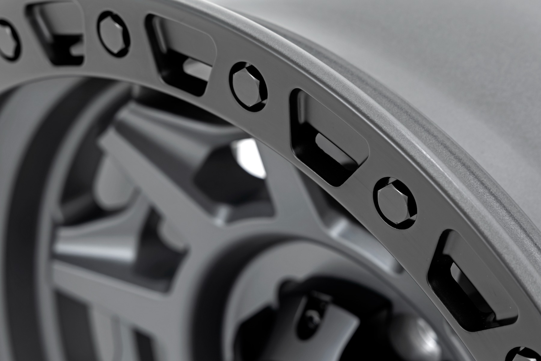Superior Design. Our Series 85 Gunmetal Gray Wheels feature a high-quality gunmetal finish with matte black simulated bead lock and one-piece aluminum construction that delivers a strong, durable wheel. These gunmetal gray color wheels boast an aggressive design and include a Rough Country black center cap, so you can tackle the road in style. Rough Country’s Gunmetal Gray, Black Wheels come with a 1-year finish and Limited Lifetime Structural Warranty.