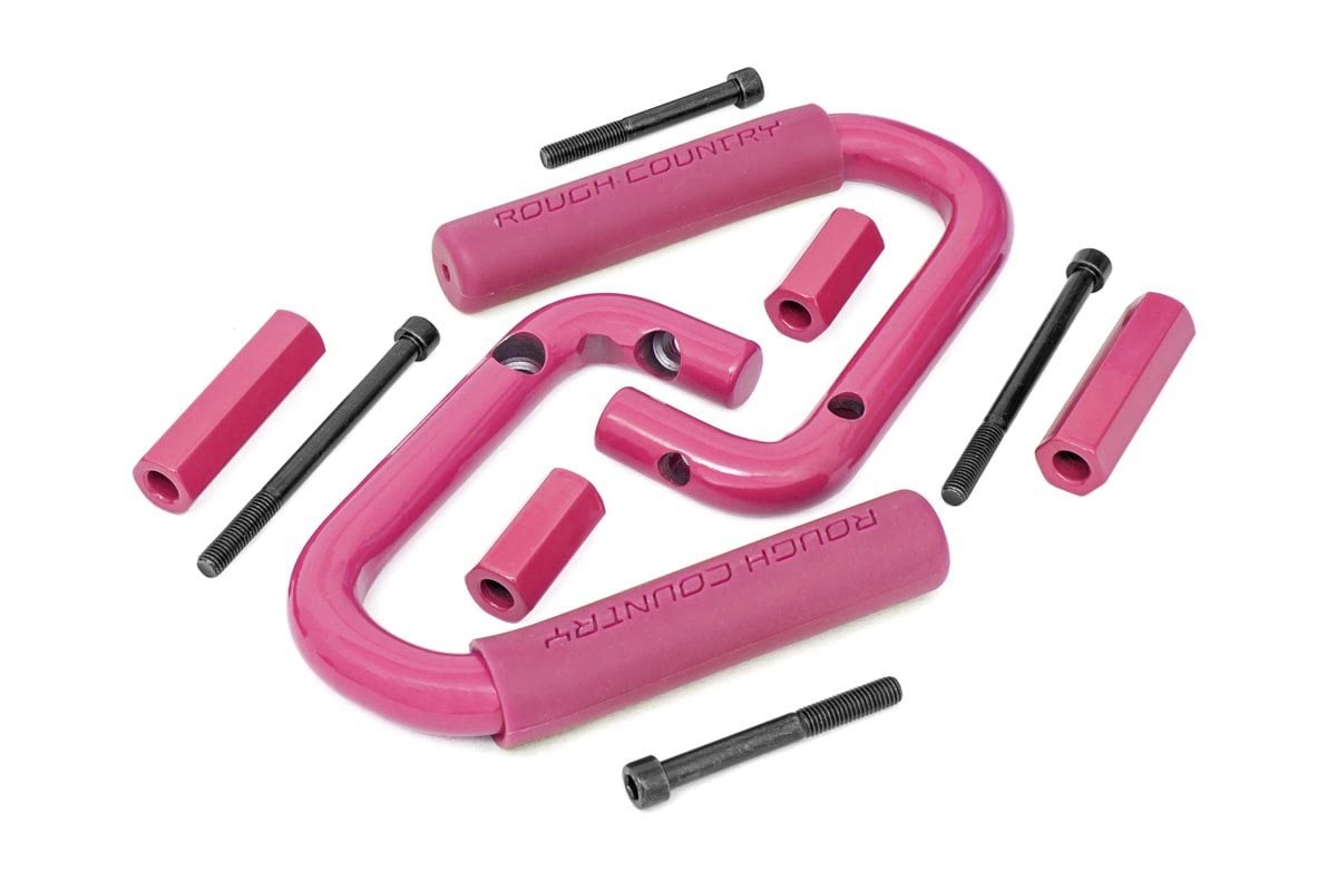 Gain easier access for getting in and out of your lifted Jeep JK with Rough Country’s Solid Steel Front Grab Handles. These heavy-duty grab handles are incredibly easy to install, and offer an easy way to climb into your cab and a convenient place to hang on when taking to the trails.Our newly redesigned handles are made with a thicker, high-quality, 7/8-inch thick steel construction and durable rubber grips with Rough Country logo, these Solid Steel Grab Handles are comfortable to hold and built to last. These easy-to-install grab handles bolt right into existing mounting points on your Jeep JK, with no drilling or complicated modifications required. Simply swap out your existing bolts with the extended bolt and thread system included with this kit for an easy upgrade that takes no-time flat! No cutting or drilling is required to mount these handles, and the result is a tight, rigid connection that wonΓÇÖt budge as you lift yourself into the cab. Rough Country’s Solid Steel Grab Handles include a Lifetime Replacement Warranty! Features: Easy bolt-on installation No drilling required Uses existing mounting holes Easier access for getting in and out of your Jeep JK Made with high-quality, 3/4-inch thick steel construction and durable rubber grips Includes Lifetime Replacement Warranty Notes: