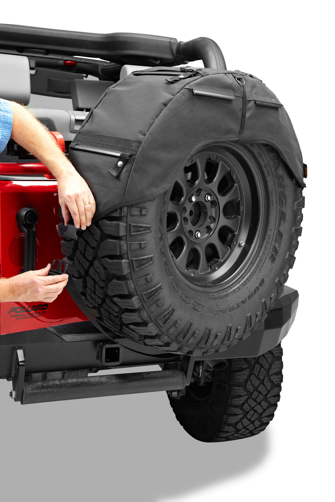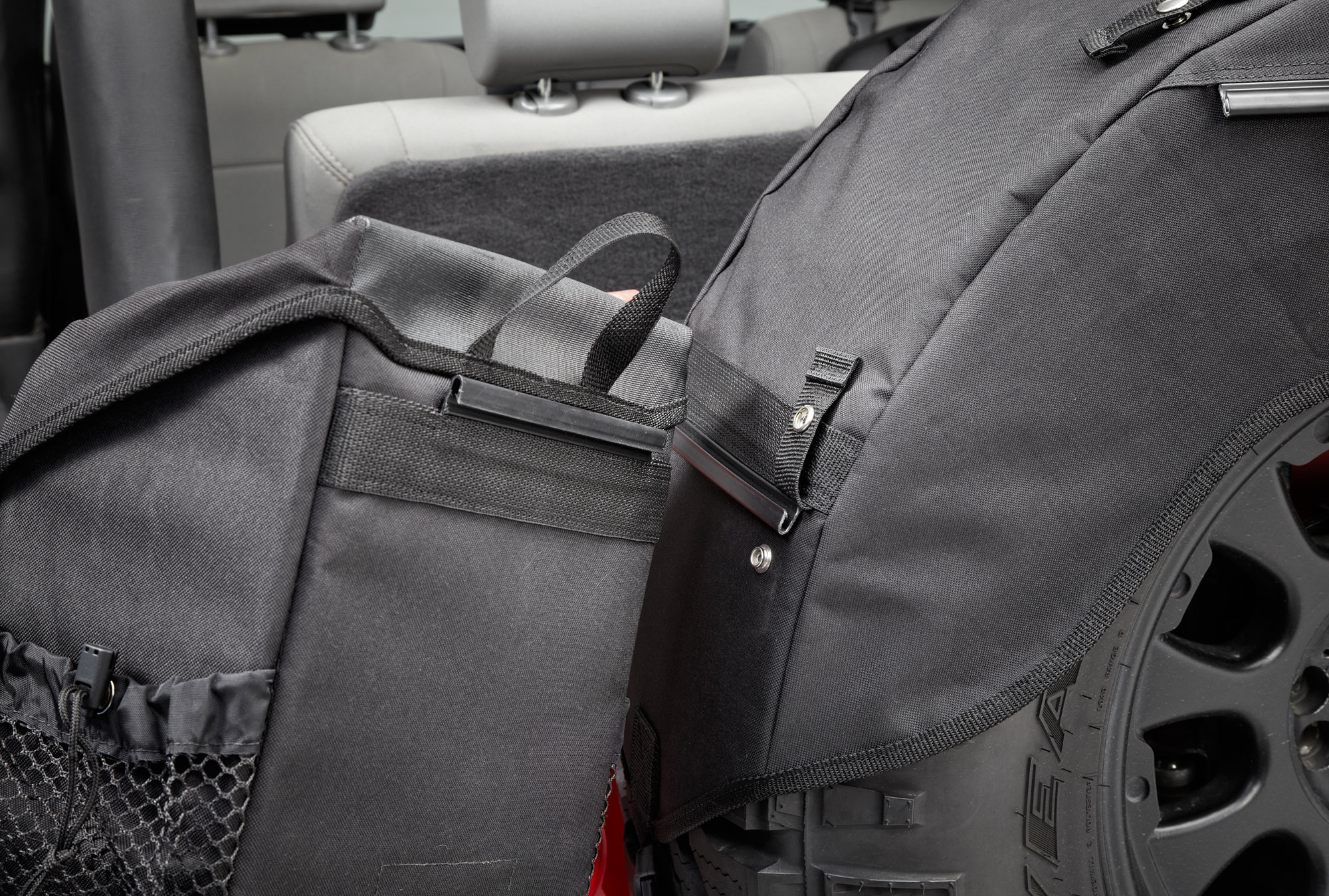 The RoughRider Spare Tire Organizer by Bestop is available in three sizes to fit from 30″ to 40″ spare tires. Made out of diamond-point fabric that is tough, and matches your soft top and other soft accessories. The Spare Tire Organizer straps onto the spare to store tools, recovery gear, clothing, first aid and more. This organizer attaches using nylon straps and buckles and is easily removable Tire Organizer.