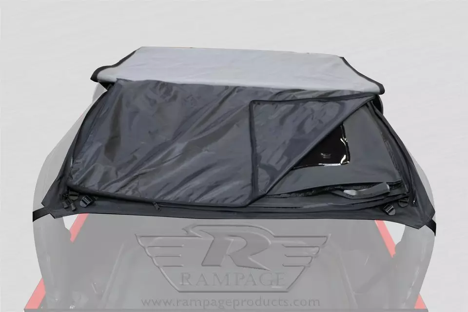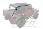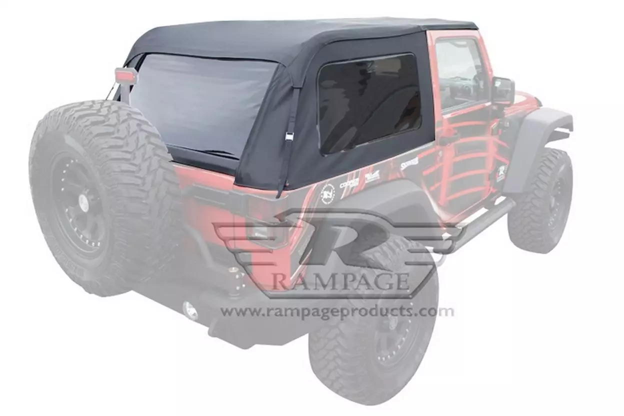 The Rampage Frameless soft top installs over the original equipment factory roll bar for a snug fit without the need for additional bows or support hardware. This unique design allows for larger side windows and improved visibility with removable side and rear windows that quickly convert the soft top into an open Island Top. Windows use heavy duty molded tooth zippers and are easily replaced or removed and stored in a special separation panel between the ceiling and roof top which is concealed and protects the windows from scratches or puncture. The fastback style offers improved aerodynamics and is considerably lighter than factory bow style tops. Rampage Sailcloth tops feature 30oz material for the quietest ride possible. This top requires the use of the Mopar® factory door surrounds and tailgate bar, as well as a header windshield channel (sold separately). Modification is required to the factory door surrounds for 2010 and newer Jeeps. The 2010 model year or later has an added extrusion nailed into the original surround that needs to be removed to work properly with the Rampage Frameless Top. It is easily removed, the surrounds will still work fine with the factory top, and the extrusion can be quickly re-installed as desired. Simply pull the extrusion out from the nails or remove the nails themselves. You can also choose to use a set of surrounds from a 2007-2009 JK (see recommended items).