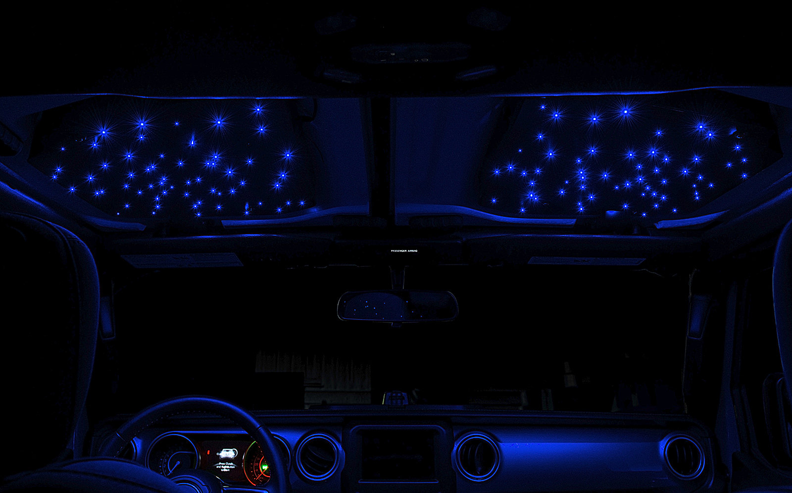 Hardtop Headliner Your Jeep Wrangler JL or Gladiator JT is one of the best vehicles on the planet for stargazing! But, what do you do if it’s cloudy and you want to see some stars? Simply install this StarLINER ColorSHIFT Fiber Optic Hardtop Headliner from Oracle Lighting and you have a mobile planetarium! The 2″ thick dense foam panels quickly and simply mount to your factory Freedom Top Panels using the included hardware and double-sided tape. An included ColorSHIFT wireless controller allows you to choose the color, patterns, and brightness of the fiber optic stars. They can even “dance” to your music. Color options are nearly limitless to allow you an extremely custom interior aesthetic. Generally installs in under an hour with simple routing of the wires to your dome light. Two quick disconnect plugs keep removal and installation of your Freedom Tops a breeze. You will also enjoy some reduction of exterior road and wind noise due to the panels. Backed by a 1-Year Warranty. Made in the USA!
